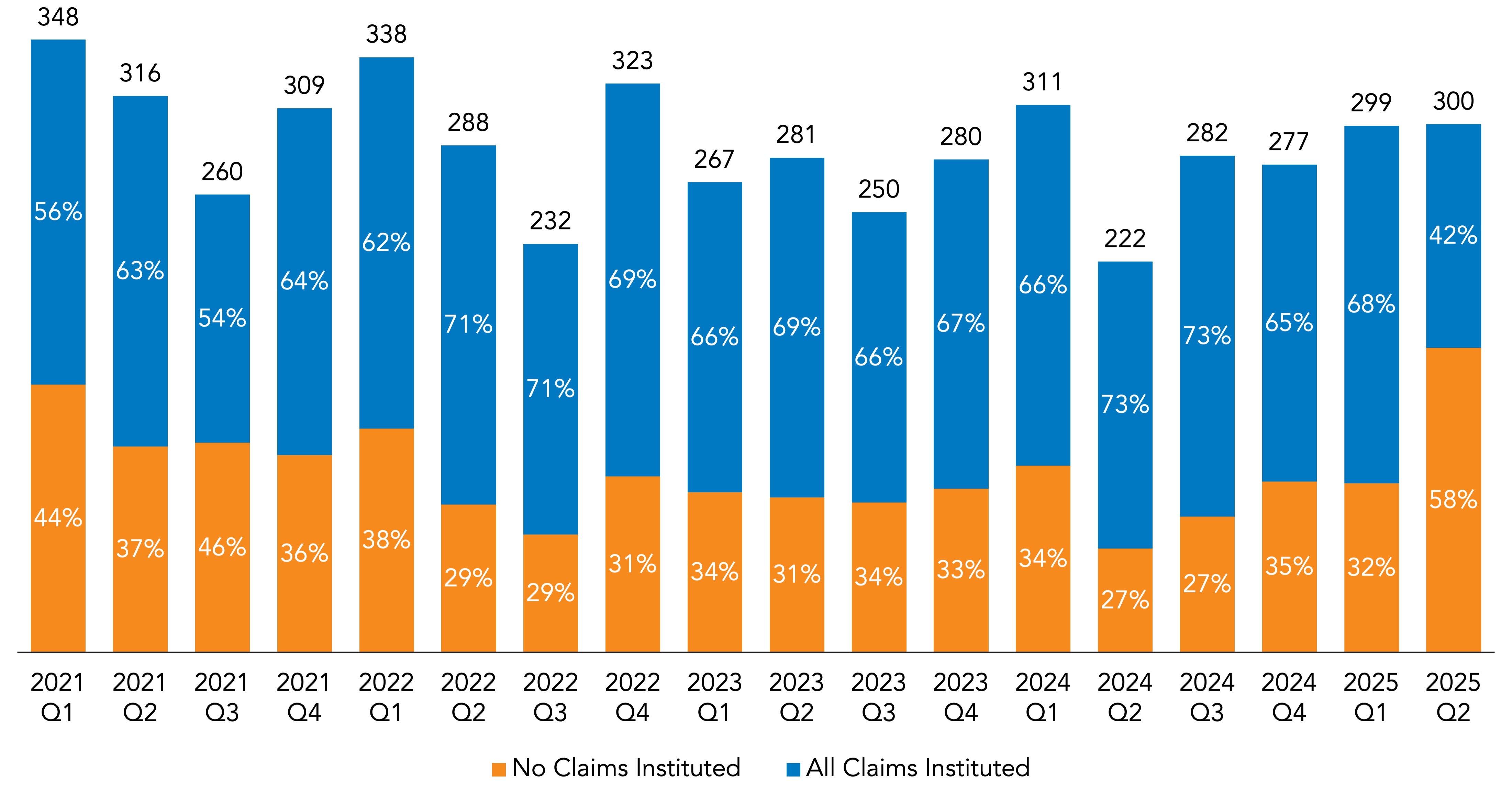 This category of litigation is shown in grey below to illustrate its magnitude. As shown by the rightmost bar, e-seller litigation in Q2 2025 accounted for 2,238 defendants added, or 71% of all litigation during the quarter—though this number remains subject to the caveat about defendants potentially having multiple online storefronts noted above.