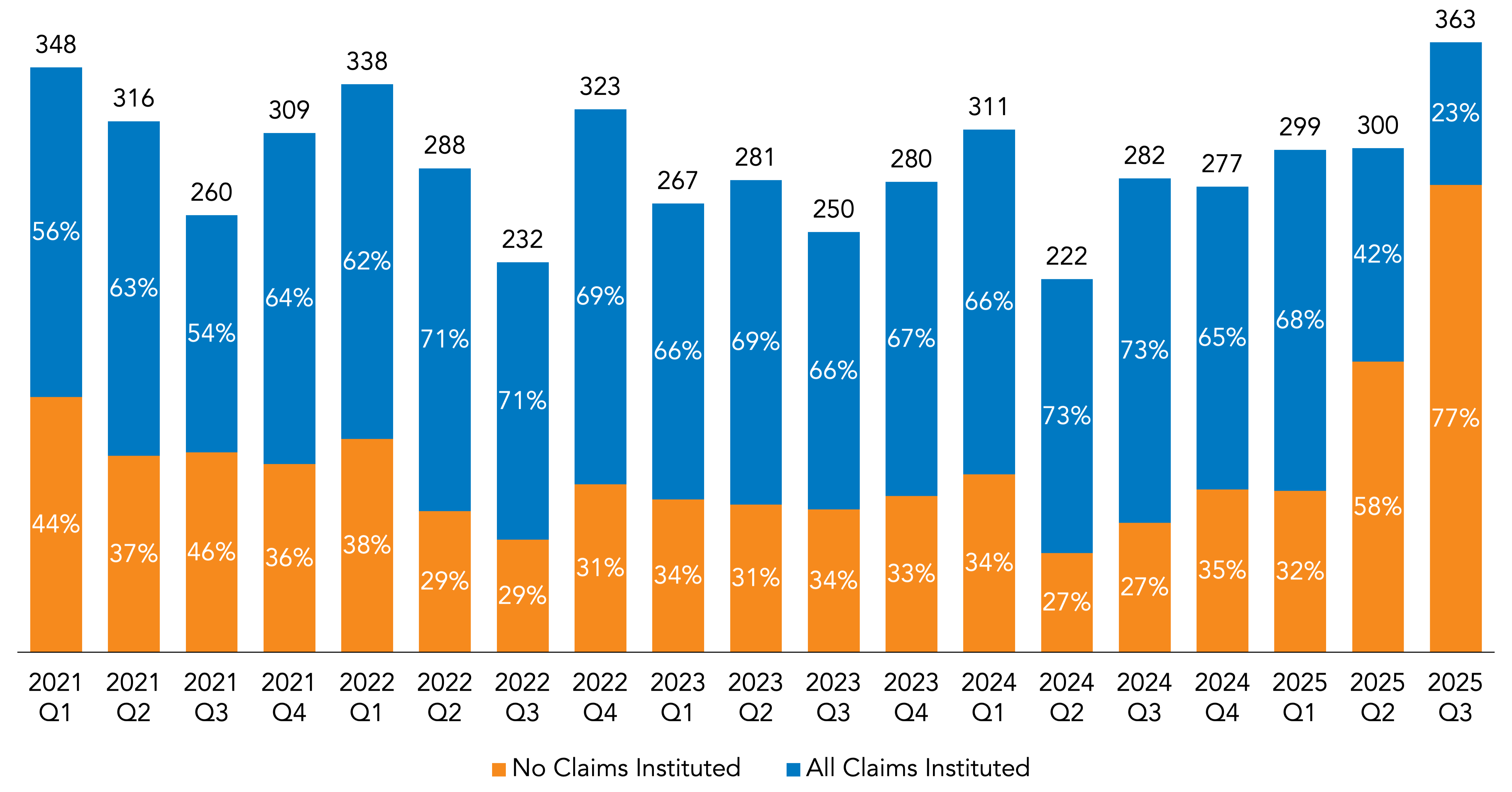 The PTAB instituted trial in just 23% of the AIA review petitions addressed in Q3, a significant drop from that same quarter last year (during which the institution rate was 73%) and from Q2 2025 (42%)—which itself was down substantially compared to Q1 (68%).